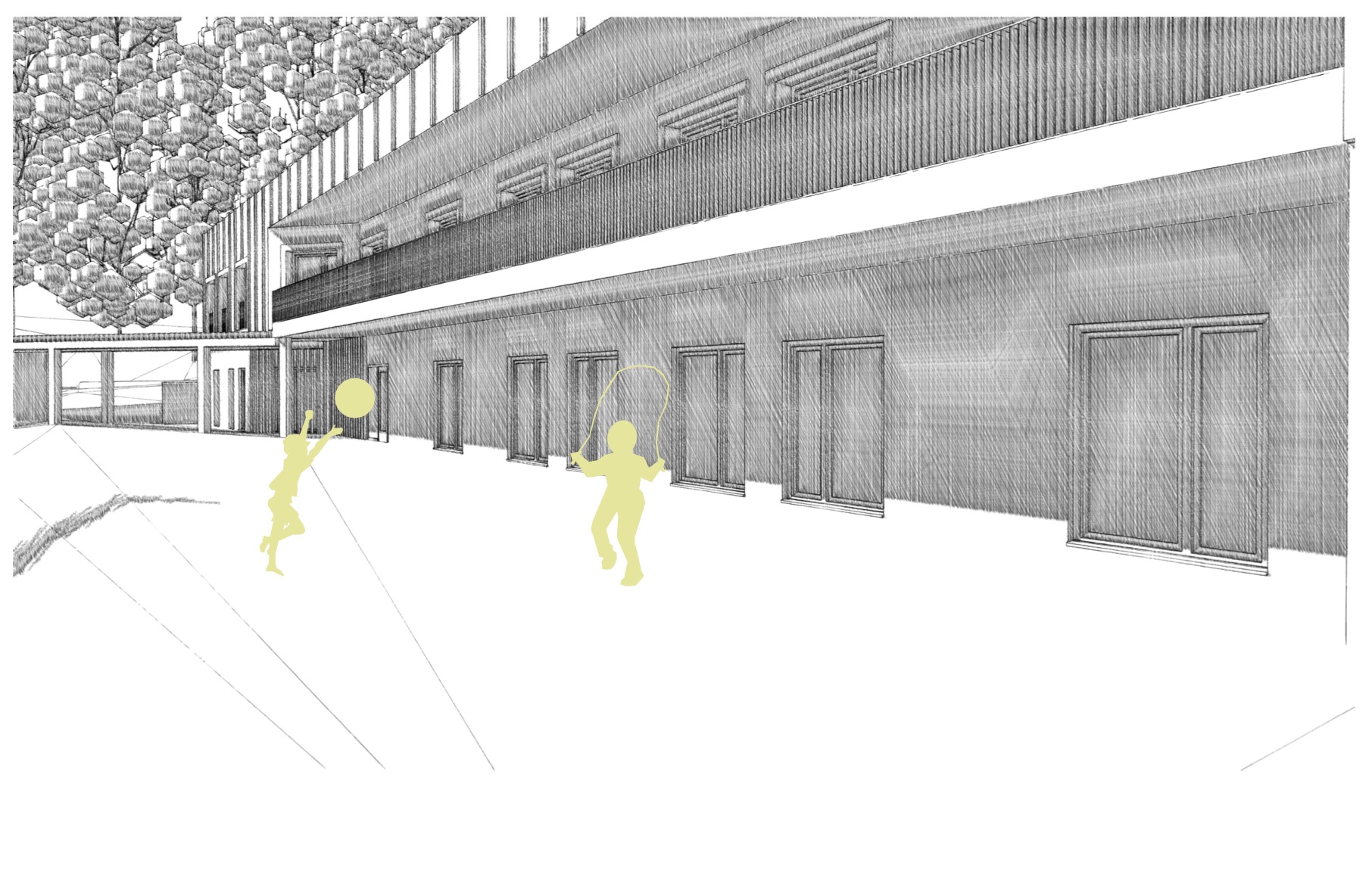 Im Erdgeschoss befinden sich Kleinkindergruppenräume, Nebenräume und ein zentraler Speiseraum, der multifunktional als Mehrzweckraum genutzt werden kann. Das Obergeschoss beherbergt weitere Gruppenräume sowie Personalbereiche, die über einen Aufzug barrierefrei erreichbar sind. Großzügige Foyers, Laubengänge und kindgerechte Außenspielbereiche mit Hangrutsche und Wasserspielplatz verbinden Innen- und Außenraum zu einem abwechslungsreichen, inspirierenden Umfeld.